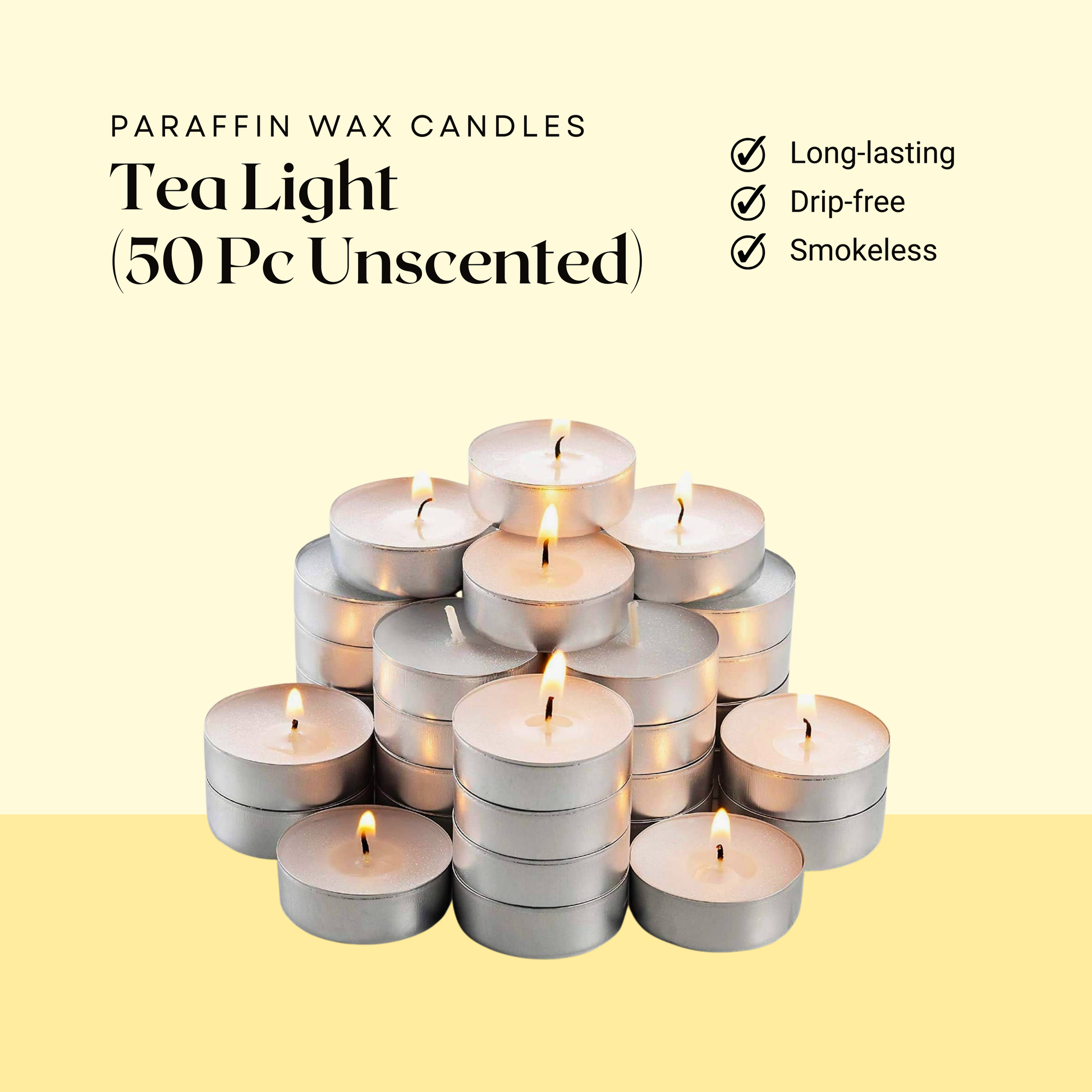 Illuminate your space with this pack of 50 unscented tea light candles. These elegant wax candles are not only visually appealing but also economical, making them perfect for large events like weddings, parties, and festive celebrations.