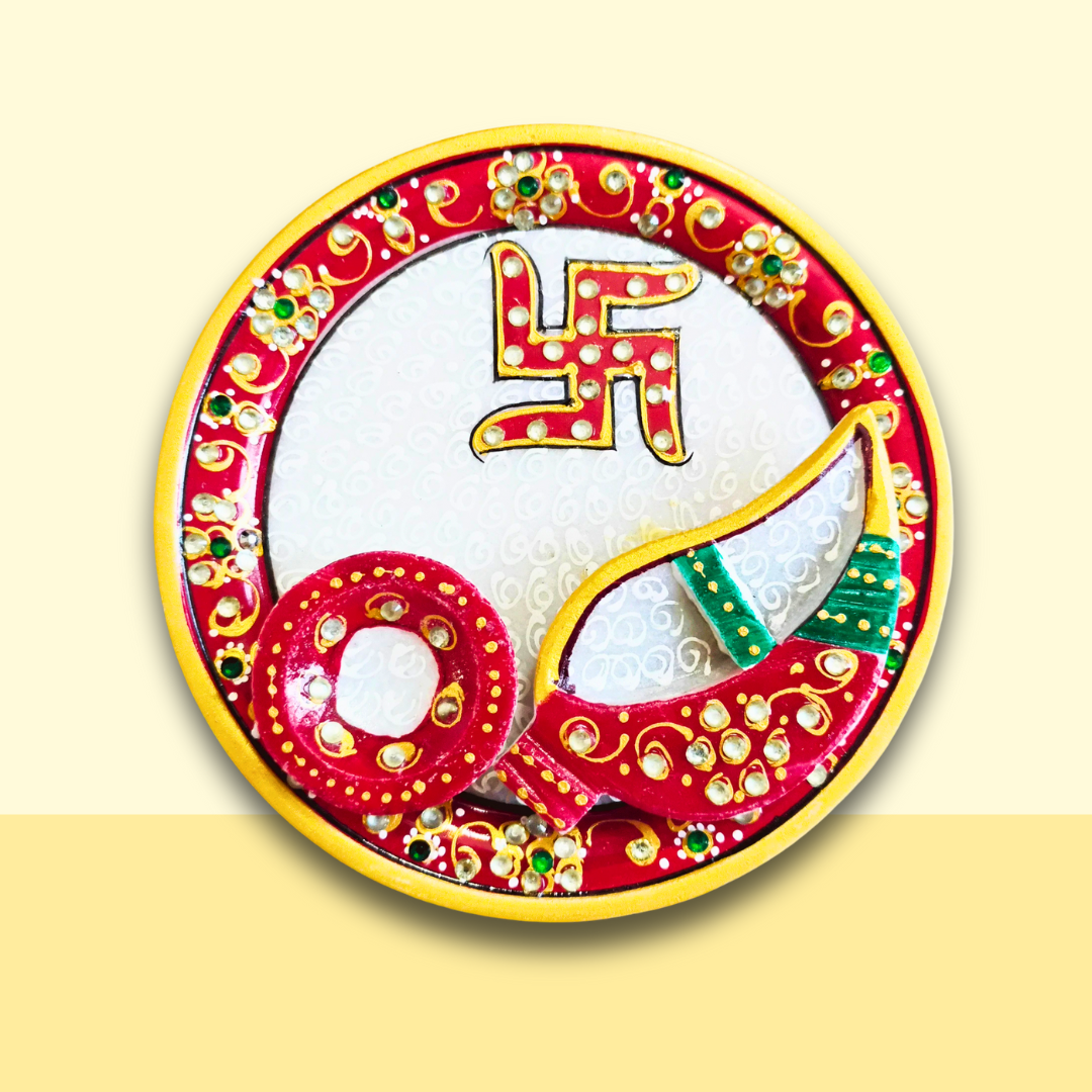 Pooja accessories from Jaipuri art come in forms such as Meenakari Sindoor Box, Tilak Tray, Marble Roli-Chawal Box, and Ganesh Deepak.