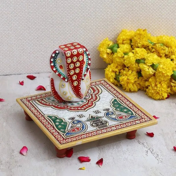 Enhance your home decor and festivities with this exquisite Ganesh Ji chowki set.
